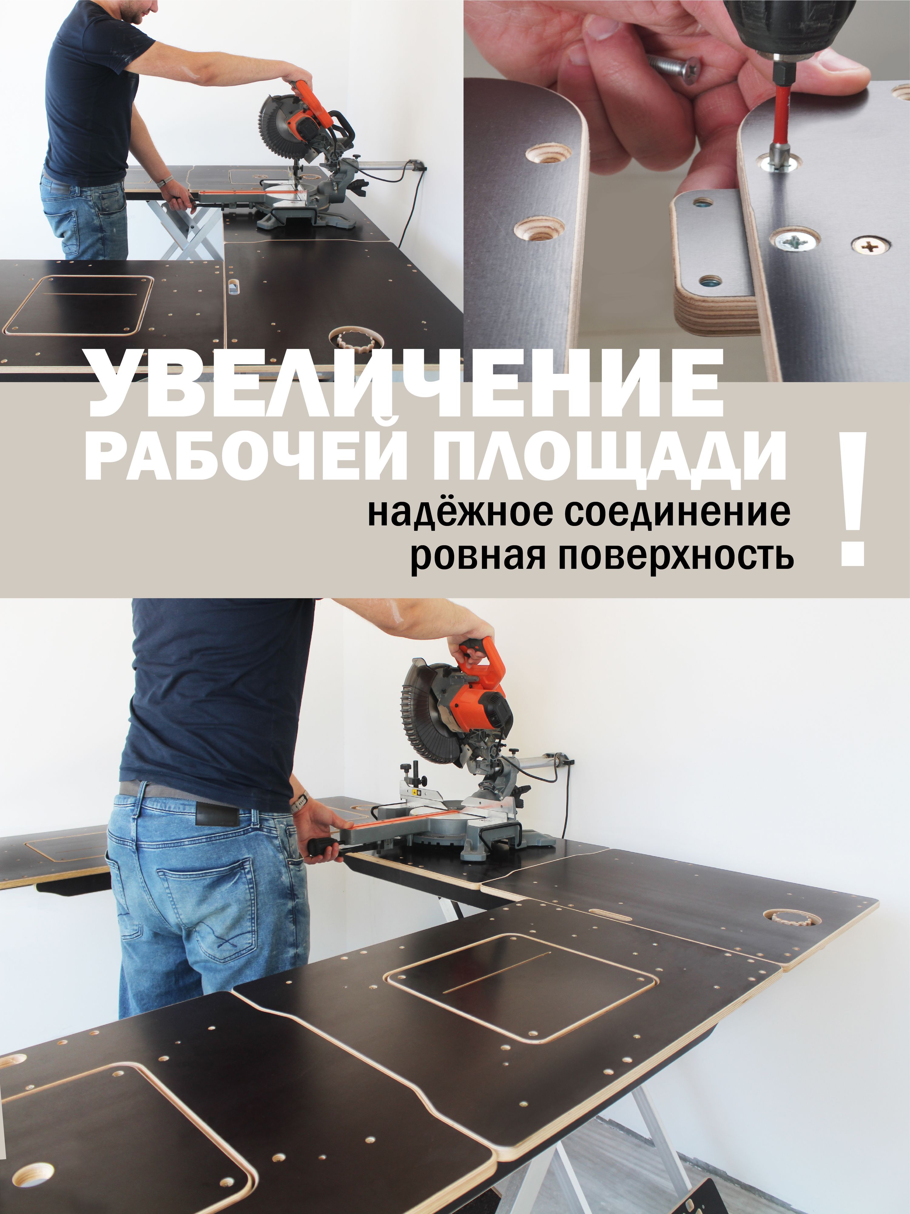 - Увеличение рабочего поля за счёт соединения двух и более верстаков.